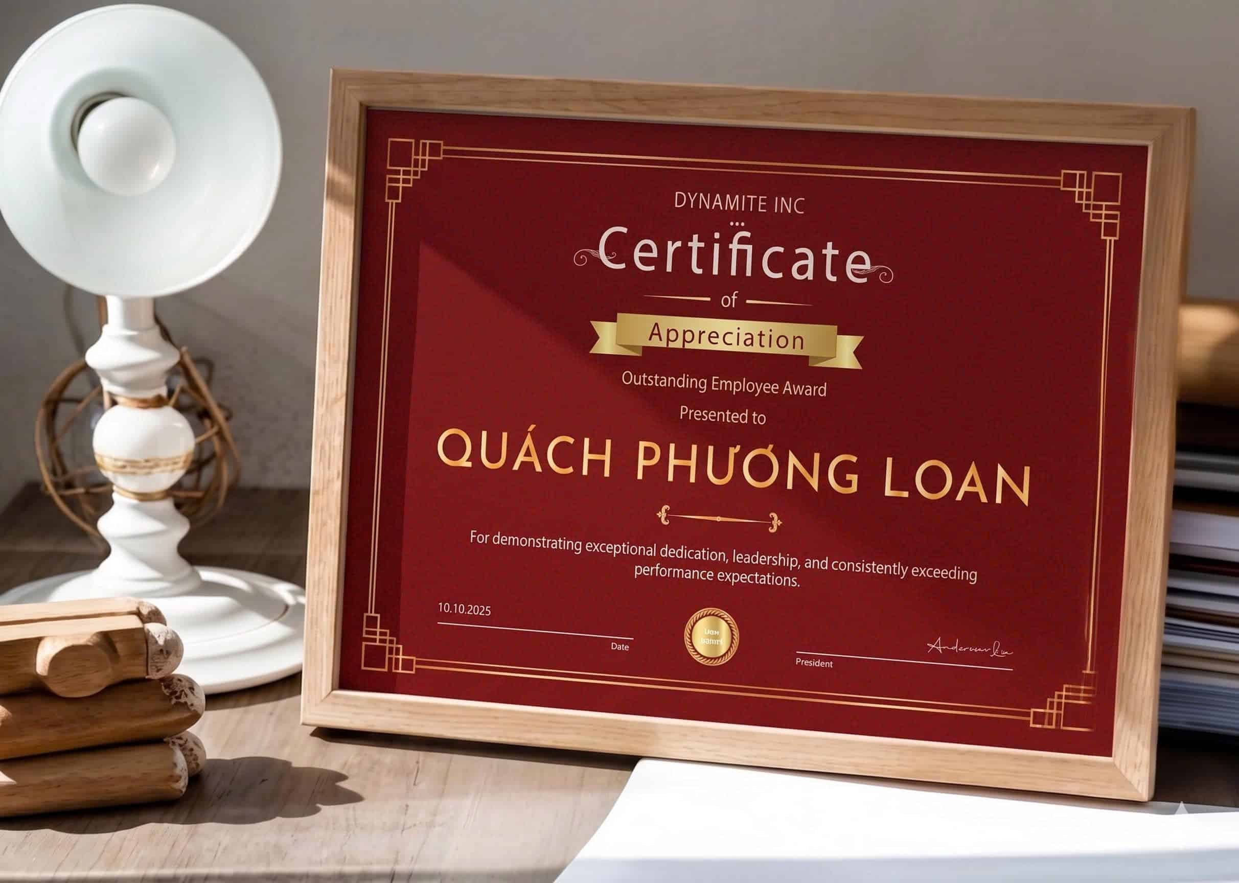 - Đẳng cấp & Sang trọng: Lớp mạ kim loại tạo hiệu ứng ánh sáng tinh tế, nâng tầm giá trị chứng chỉ.